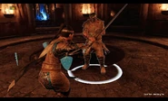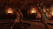 In combat, Guardians are very aggressive, acting much like a Defense form Highlander, but able to perform uninterruptible attacks without needing to enter an Attack form. They rarely pause between attacks to regain stamina. When they are out of stamina, they play defensive until they get it back. Their Heavy Attacks are powerful, unblockable and uninterruptible, but are slow enough to be easily parried. They will also sometimes use their light attack, which are uninterruptible and swift.