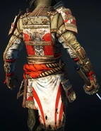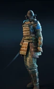 A perfect balance between flexibility and strength, the default armor is composed of laqured wood that cover most of the body with worn leather and cloth underneath. They wear a traditional kabuto, though it lacks any sort of tehen kanamono or decorative crest. Their dull gray mempo is simplistic and covers their mouth and nose, with dashes of tan paint that gives the image of sharp teeth.