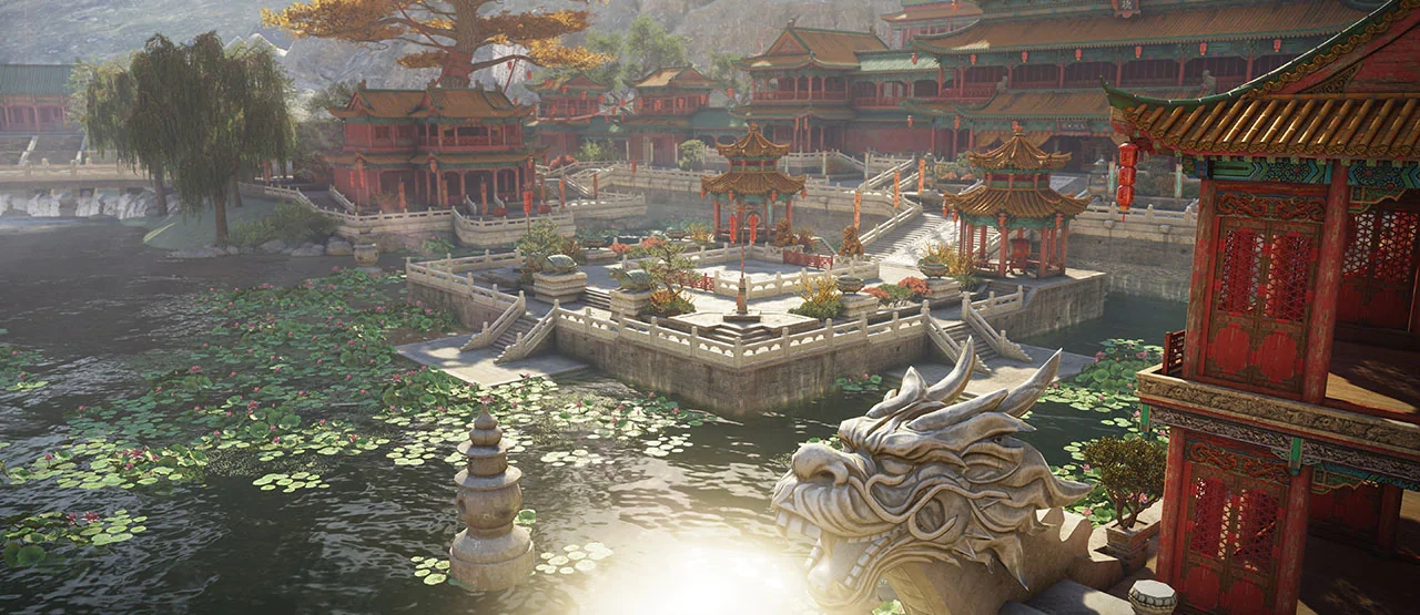 The Belvedere is a large platform that oversees a lake. Towards the land side of the map, there is a majestic temple and other magnificent Wu Lin architecture.